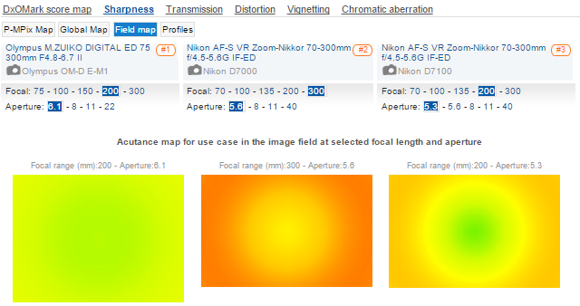 (**) vysvetlenia merania DxO marku: zelená = ostré, žltá až oranžová = menej ostré, červená = neostré