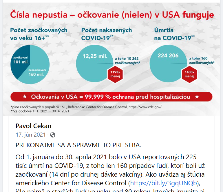 Kedze som v statuse pridal aj referenciu z ktorej vychadzaju cisla, tak urcite som neklamal. A ani to nebola propaganda, lebo to boli oficialne cisla z USA. Prisiel delta variant, klesla efektivita vakcin, mame iny pomer zaockovanych/nezaockovanych, sme na zaciatku 3. vlny a nie v priebehu tej druhej, ine absolutne cislo nakazenych, atd. Vytiahnut tento stary status a na nom zalozit, co z toho vyplyva, tak skor manipulacia je to a), b) a c). Ale nevadi. V oktobri a novembri sa mozme k tomuto statusu vratit. Uvidime, aky bude % zaockovanych v nemocniciach a ake bude ich % umrti. A hlavne sa mozme vratit k tomuto statusu a jeho poslednemu paragrafu.