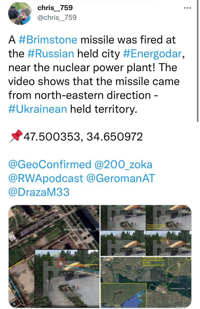 Západní experti ukázali, že riadená strela Brimstone odpálená na Energodar (kde sa nachádza Záporožská jadrová elektráreň) bola vypustená z územia kontrolovaného ozbrojenými silami Ukrajiny.