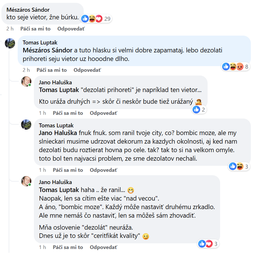 Problém dnešných diskusií je aj to, že slová „dezolát“, „mafián“, „extrémista“ alebo „fašista“ od tých, ktorí sami seba nazývajú „slušní“, dnes nie je brané ako nadávka. Na facebooku nikoho za toto nezablokujú. Ale keď niekto na toto podpichovanie odpovie s „írečitejšie“, tak je zrazu z neho hulvát. Už len táto „drobná“ nespravodlivosť spôsobuje, že urážaní „dezoláti“ vnímajú pohoršovanie sa nad urážkami ako pokrytectvo. A naopak, „slušnoľudia“ nevnímajú, čo svojimi rečami činia.