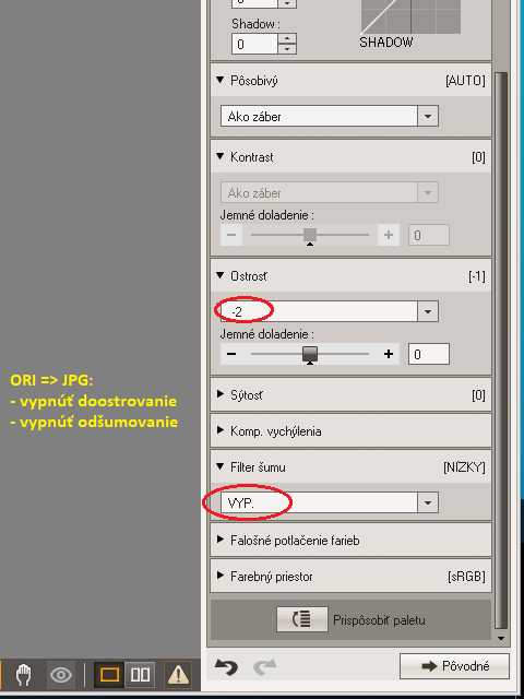 Pri vytváraní JPG z ORI súboru teda odporúčam vypnúť aj doostrovanie aj odšumovanie: