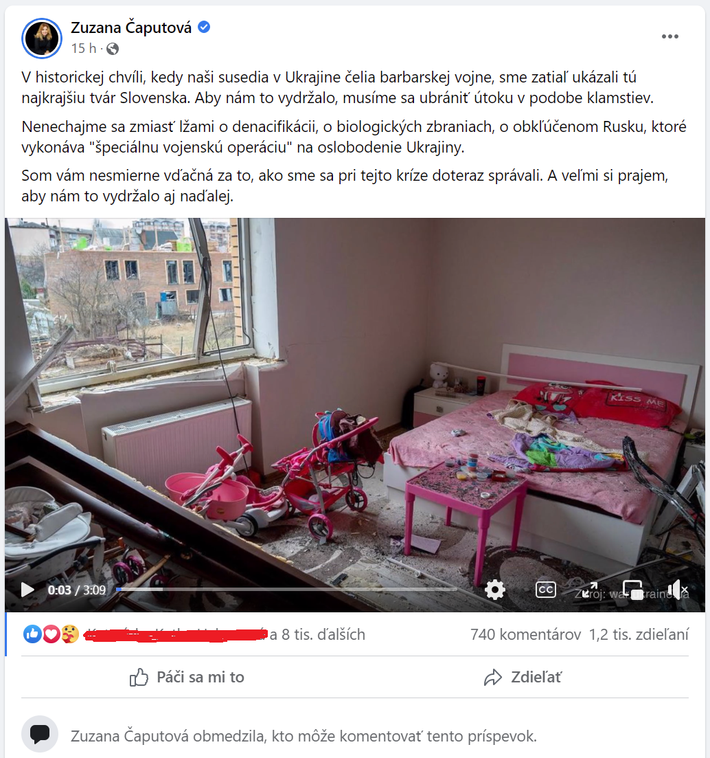 Vo svojom statuse s videom z 5.4.2022, naša prezidentka popierala zjavné fakty (ktoré sú preukázané aj v tomto článku):